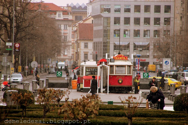 Os únicos examplares que encontramos, dos músicos de rua que aparentemente enchem a cidade em dias mais quentes. Café Tramvaj. Um antigo elétrico "atracado" no meio da Praça Venceslau qé agora uma café com excelentes snacks (dizia o LonelyPlanet). Estáva fechado quando lá passamos.